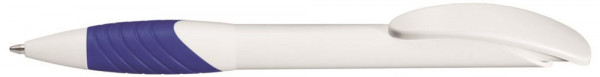 Druckkugelschreiber mit weißem matten Gehäuse und Bogenclipdrücker. Ergonomische Gummigriffzone in gedeckten Farben.