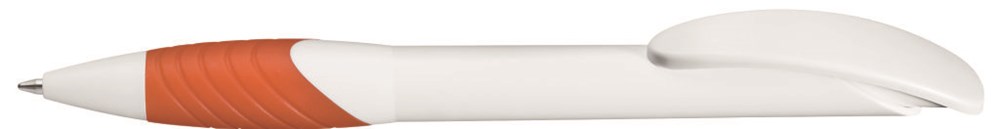 Druckkugelschreiber mit weißem matten Gehäuse und Bogenclipdrücker. Ergonomische Gummigriffzone in gedeckten Farben.