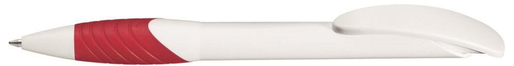 Druckkugelschreiber mit weißem matten Gehäuse und Bogenclipdrücker. Ergonomische Gummigriffzone in gedeckten Farben.