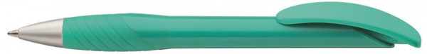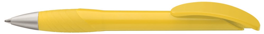 Druckkugelschreiber mit uni gedeckt glänzendem Gehäuse, ergonomischer Gummigriffzone, Bogenclipdrücker mit Metallspitze mattchrom.