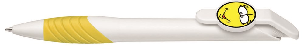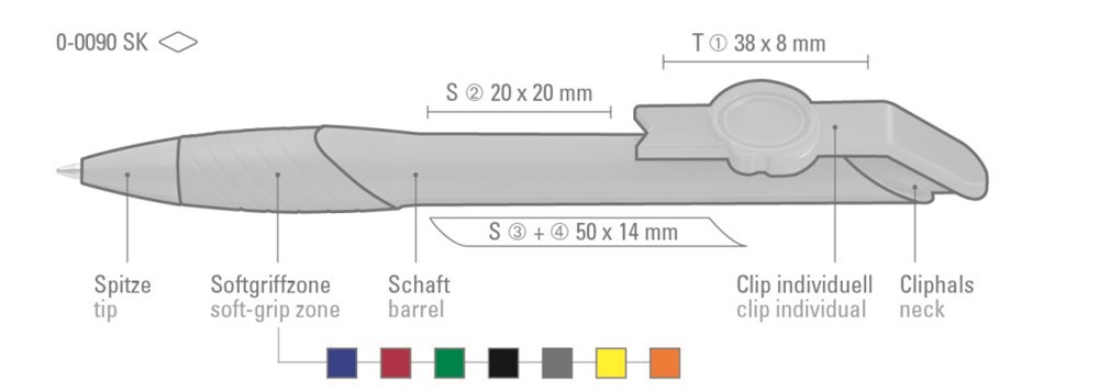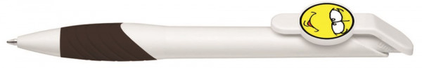 Druckkugelschreiber mit individuell gestaltbarem Clipdrücker. Gehäuse gedeckt, mit ergonomischer Gummigriffzone. Motivgröße nach Absprache; max.: ca. 30 x 20 x 2,2mm