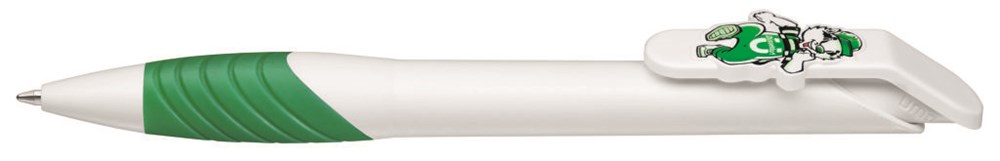 Druckkugelschreiber mit individuell gestaltbarem Clipdrücker. Gehäuse gedeckt, mit ergonomischer Gummigriffzone. Motivgröße nach Absprache; max.: ca. 30 x 20 x 2,2mm