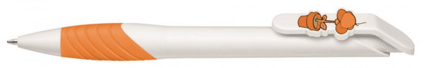 Druckkugelschreiber mit individuell gestaltbarem Clipdrücker. Gehäuse gedeckt, mit ergonomischer Gummigriffzone. Motivgröße nach Absprache; max.: ca. 30 x 20 x 2,2mm