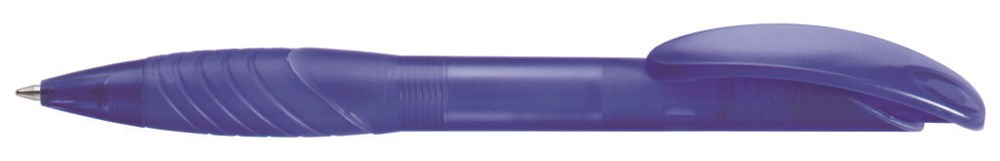 Druckkugelschreiber mit transparent gefrostetem Gehäuse, ergonomischer Gummigriffzone und Bogenclipdrücker.