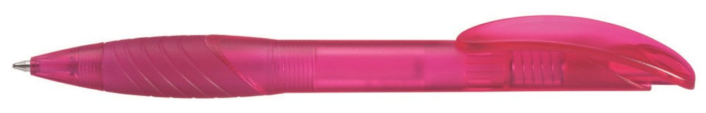 Druckkugelschreiber mit transparent gefrostetem Gehäuse, ergonomischer Gummigriffzone und Bogenclipdrücker.