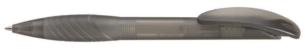 Druckkugelschreiber mit transparent gefrostetem Gehäuse, ergonomischer Gummigriffzone und Bogenclipdrücker.