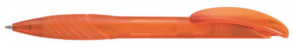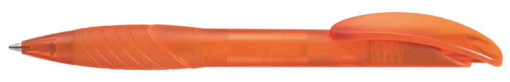 Druckkugelschreiber mit transparent gefrostetem Gehäuse, ergonomischer Gummigriffzone und Bogenclipdrücker.