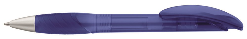 Druckkugelschreiber mit uni transparent glänzendem Gehäuse, ergonomischer Gummigriffzone, Bogenclipdrücker und Metallspitze mattchrom.