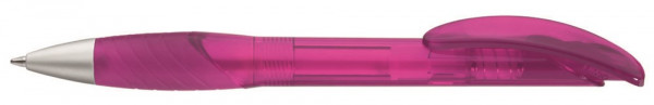 Druckkugelschreiber mit uni transparent glänzendem Gehäuse, ergonomischer Gummigriffzone, Bogenclipdrücker und Metallspitze mattchrom.
