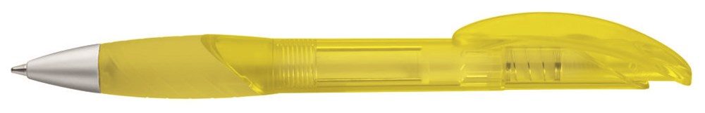 Druckkugelschreiber mit uni transparent glänzendem Gehäuse, ergonomischer Gummigriffzone, Bogenclipdrücker und Metallspitze mattchrom.