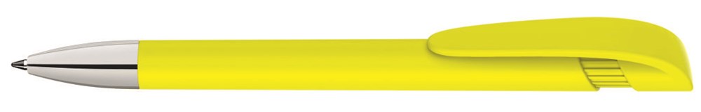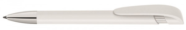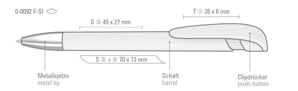Druckkugelschreiber mit matt gedecktem Gehäuse, breitem Bogenclipdrücker und silberne Spitze glanzverchromt.