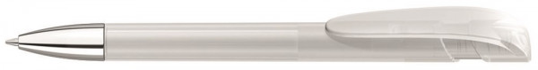 Druckkugelschreiber in uni transparent gefrostetem Gehäuse, breitem Bogenclipdrücker und silberner Spitze glanzverchromt. Minentype: uma Flow Motion Refill K1.0 Minenfarbe: blau