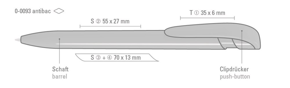 Druckkugelschreiber mit gedeckt glänzendem, antibakteriellen Gehäuse. Der nach ISO 22196:2011 geprüfte antimikrobielle Zusatz aus Silberionen verleiht dem Kunststoff eine antibakterielle Wirkung, die eine Haftung und Ansiedlung von Bakterien oder Krankheitserregern auf der Oberfläche des Schreibgerätes um 99,99% verringert.