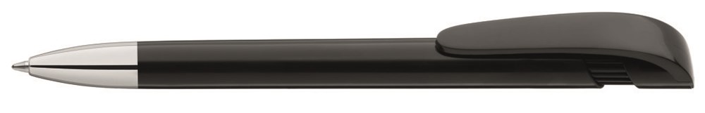 Druckkugelschreiber mit gedeckt glänzendem Gehäuse, schwerer Metallspitze glanzverchromt und breitem Bogenclipdrücker.