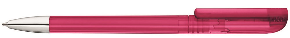 Drehkugelschreiber mit transparent glänzendem Gehäuse, gefrosteter Clipoberfläche und Spitze glanzverchromt.