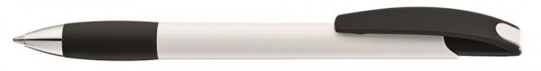 Druckkugelschreiber mit gedeckt glänzendem Gehäuse in weiß, mit gepolsterter, farbiger Softgriffzone mit Clipdrückermechanik. Drückerstopfen und Spitze in silber glänzend. Ab 2.000 Stück können alle Teile miteinander kombiniert werden.