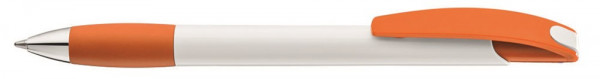 Druckkugelschreiber mit gedeckt glänzendem Gehäuse in weiß, mit gepolsterter, farbiger Softgriffzone mit Clipdrückermechanik. Drückerstopfen und Spitze in silber glänzend. Ab 2.000 Stück können alle Teile miteinander kombiniert werden.