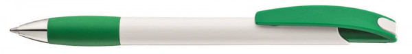 Druckkugelschreiber mit gedeckt glänzendem Gehäuse in weiß, mit gepolsterter, farbiger Softgriffzone mit Clipdrückermechanik. Drückerstopfen und Spitze in silber glänzend. Ab 2.000 Stück können alle Teile miteinander kombiniert werden.