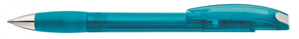Druckkugelschreiber mit uni transparent glänzendem Gehäuse und gepolsterter Softgriffzone mit Clipdrückermechanik. Drückerstopfen und Spitze silber glänzend. Ab 2.000 Stück können alle Teile miteinander kombiniert werden.