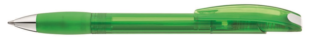 Druckkugelschreiber mit uni transparent glänzendem Gehäuse und gepolsterter Softgriffzone mit Clipdrückermechanik. Drückerstopfen und Spitze silber glänzend. Ab 2.000 Stück können alle Teile miteinander kombiniert werden.