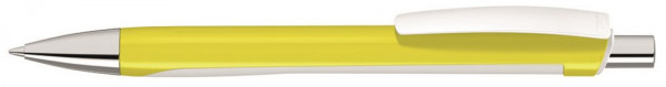 Druckkugelschreiber mit zweigeteiltem Schaft aus gedeckt glänzender Vorderseite und weiß gummierter Softtouch-Rückseite. Clip in gedeckt weiß. Spitze und Drücker silber glanzverchromt. Minentype: uma Tech Refill 1.0, schwarzes Rohr Minenfarbe: blau