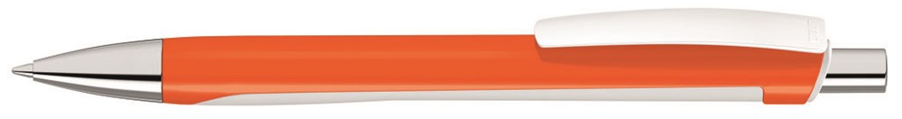 Druckkugelschreiber mit zweigeteiltem Schaft aus gedeckt glänzender Vorderseite und weiß gummierter Softtouch-Rückseite. Clip in gedeckt weiß. Spitze und Drücker silber glanzverchromt.