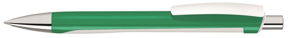 Druckkugelschreiber mit zweigeteiltem Schaft aus gedeckt glänzender Vorderseite und weiß gummierter Softtouch-Rückseite. Clip in gedeckt weiß. Spitze und Drücker silber glanzverchromt.