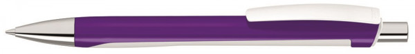Druckkugelschreiber mit zweigeteiltem Schaft aus gedeckt glänzender Vorderseite und weiß gummierter Softtouch-Rückseite. Clip in gedeckt weiß. Spitze und Drücker silber glanzverchromt.