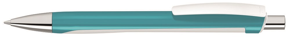 Druckkugelschreiber mit zweigeteiltem Schaft aus gedeckt glänzender Vorderseite und weiß gummierter Softtouch-Rückseite. Clip in gedeckt weiß. Spitze und Drücker silber glanzverchromt.