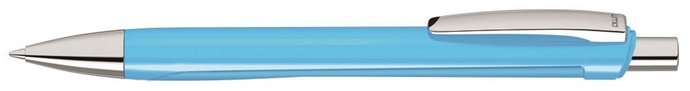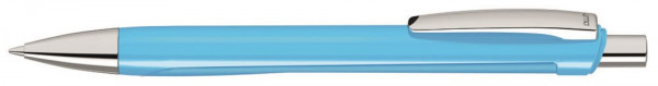 Druckkugelschreiber mit zweigeteiltem Schaft, aus gedeckt glänzender Vorderseite und gummierter Softtouch-Rückseite unifarben. Metallclip, Spitze und Drücker silber glanzverchromt.