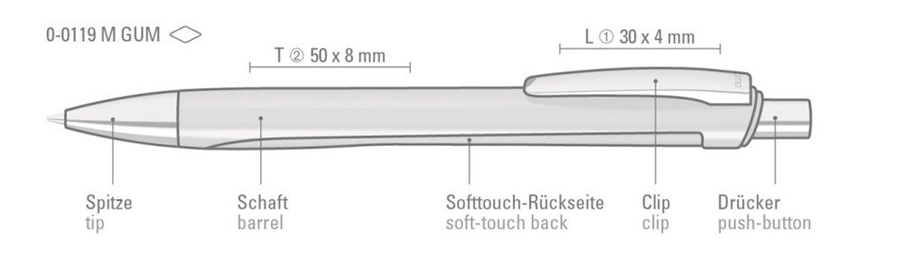 Druckkugelschreiber mit zweigeteiltem Schaft, aus gedeckt glänzender Vorderseite und gummierter... mehr