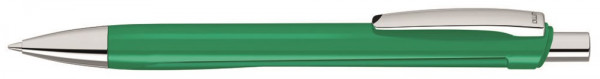 Druckkugelschreiber mit zweigeteiltem Schaft, aus gedeckt glänzender Vorderseite und gummierter Softtouch-Rückseite unifarben. Metallclip, Spitze und Drücker silber glanzverchromt.