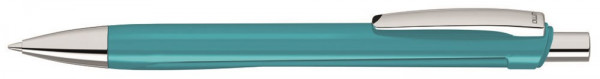 Druckkugelschreiber mit zweigeteiltem Schaft, aus gedeckt glänzender Vorderseite und gummierter Softtouch-Rückseite unifarben. Metallclip, Spitze und Drücker silber glanzverchromt.