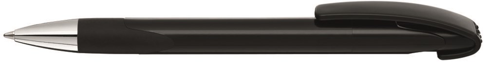Druckkugelschreiber mit gedeckt glänzendem Gehäuse, schwerer glänzender Metallspitze, geschwungenem Clipdrücker und Gummigriffzone.