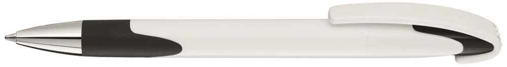 Druckkugelschreiber mit gedeckt glänzendem Gehäuse, schwerer glänzender Metallspitze, geschwungenem Clipdrücker und Gummigriffzone.