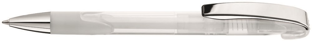 Druckkugelschreiber mit transparent glänzendem Gehäuse, schwerer Metallspitze, Metallclip glanzverchromt und Gummigriffzone.