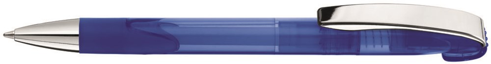 Druckkugelschreiber mit transparent glänzendem Gehäuse, schwerer Metallspitze, Metallclip glanzverchromt und Gummigriffzone.