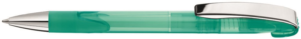 Druckkugelschreiber mit transparent glänzendem Gehäuse, schwerer Metallspitze, Metallclip glanzverchromt und Gummigriffzone.