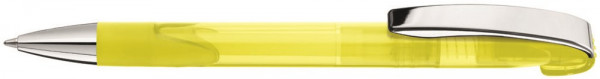 Druckkugelschreiber mit transparent glänzendem Gehäuse, schwerer Metallspitze, Metallclip glanzverchromt und Gummigriffzone.