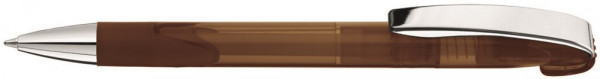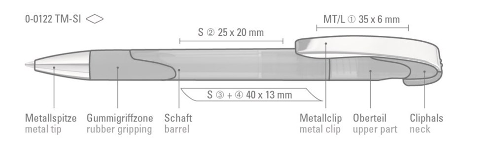 Druckkugelschreiber mit transparent glänzendem Gehäuse, schwerer Metallspitze, Metallclip glanzverchromt und Gummigriffzone.