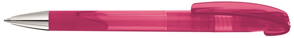 Druckkugelschreiber mit transparent glänzendem Gehäuse, schwerer glänzender Metallspitze, geschwungenem Clipdrücker und Gummigriffzone.