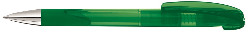 Druckkugelschreiber mit transparent glänzendem Gehäuse, schwerer glänzender Metallspitze, geschwungenem Clipdrücker und Gummigriffzone.