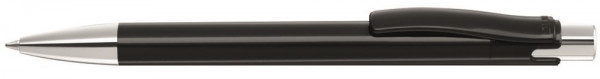 Druckkugelschreiber mit gedeckt glänzendem Gehäuse, schwerer glänzender Metallspitze und schwerem Metalldrücker.