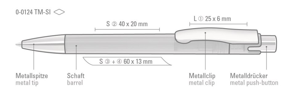 Druckkugelschreiber mit transparent glänzendem Gehäuse, schwerer Metallspitze, Metalldrücker und Metallclip glanzverchromt.