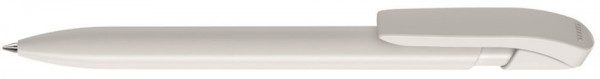 Druckkugelschreiber mit gedeckt glänzendem Gehäuse in uni weiß oder schwarz bzw. Manschette in transparent glänzend.