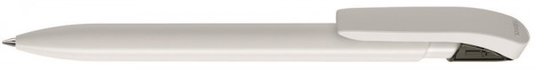 Druckkugelschreiber mit gedeckt glänzendem Gehäuse in uni weiß oder schwarz bzw. Manschette in transparent glänzend.