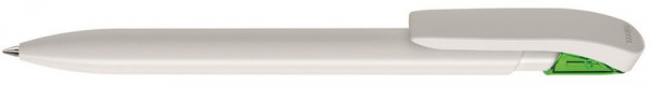 Druckkugelschreiber mit gedeckt glänzendem Gehäuse in uni weiß oder schwarz bzw. Manschette in transparent glänzend.