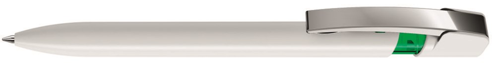 Druckkugelschreiber mit gedeckt glänzendem Gehäuse in uni weiß oder schwarz bzw. Cliphals transparent glänzend, Metallclip glanzverchromt.