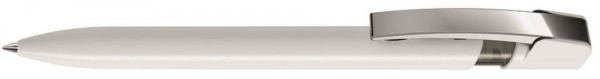 Druckkugelschreiber mit gedeckt glänzendem Gehäuse in uni weiß oder schwarz bzw. Cliphals transparent glänzend, Metallclip glanzverchromt.