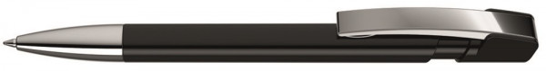 Druckkugelschreiber mit gedeckt glänzendem Gehäuse in uni weiß oder schwarz. Metallclip und schwere Metallspitze glanzverchromt. Minentype: uma Tech Refill 1.0, schwarzes Rohr Minenfarbe: blau